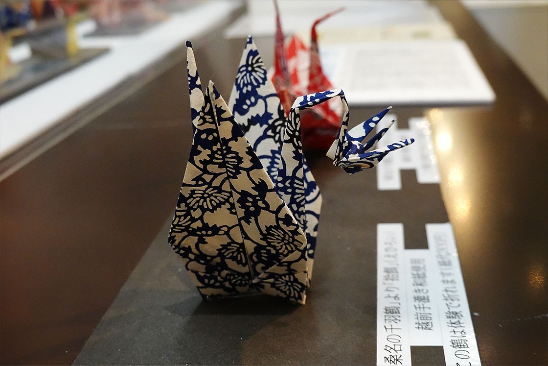 But the creative in me was most excited by the array of origami at the far end of the exhibition room upstairs. This particular type of origami uses just one piece of paper to fold multiple cranes attached to one another without cutting or using extra paper. The original instruction book was published in 1797, based on the creations of a Kuwana monk. The instruction books only show the fold lines, without detailed steps, so only experienced origami folders can crack it!