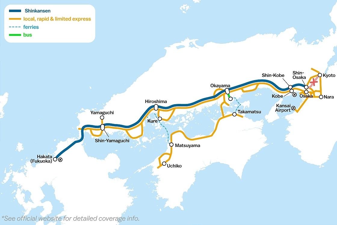 What sets this pass apart from other rail passes is that it also covers a few other ferries in the Seto Inland Sea: the Hiroshima-Kure-Matsuyama line, which offers a useful and efficient alternative route to travel between Honshu and Shikoku, and the ferries connecting the island of Shodoshima to Okayama and Takamatsu. Additionally, the pass covers all city trams in Okayama and the bus to get to Shin-Okayama Port, adding value and convenience.