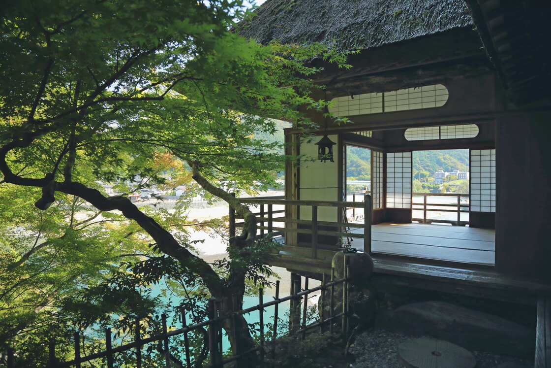 Garyu Sanso, standing in Ozu's most scenic spot, was completed by Torajiro Kouchi, who made his fortune in the Japan wax trade. It took 10 years to conceive and 3 years and 8 months to construct. Built to preserve the culture of the Japanese tea ceremony, Garyu Sanso is often called a masterpiece of traditional Japanese architecture, incorporating Sukiya-zukuri (tea house style) designs. Of particular note is the building known as "Furoan," a structure built using kake-zukuri (suspension construction) overhanging the Hijikawa River that flows through Ozu (similar to the famous stage at Kiyomizu-dera Temple in Kyoto). The building itself is designed to resemble a boat, with the ceiling shaped like the bottom of a ship's hull. The design features a clever mechanism where the moon rising from the opposite bank reflects off the river surface and illuminates the ceiling, brightening the room with moonlight.