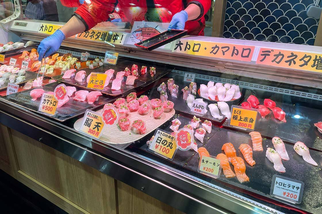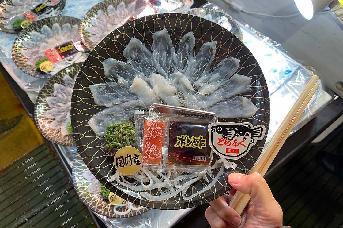 At Karato Market, visitors can enjoy pufferfish at one of the nearby restaurants or purchase properly prepared fugu with its poison already removed to take away. During my visit, I quickly realized that one of the best times to come is on Fridays and weekends when the Bakangai "sushi battle" event is held. This was easily one of the most fun fish market experiences I have had, and I may or may not have gone a little overboard with the sushi ordering. Participating shops display a variety of sushi, and visitors simply pick and pay for what they want.