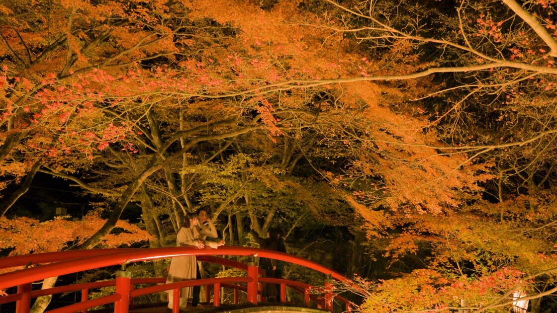 Another must-see highlight is the seasonal foliage at Kajika Bridge, where the harmony between the vermilion-lacquered Japanese arched bridge and the vivid crimson maple leaves during peak autumn foliage season is breathtaking. At night, the bridge is illuminated, creating a truly enchanting landscape.