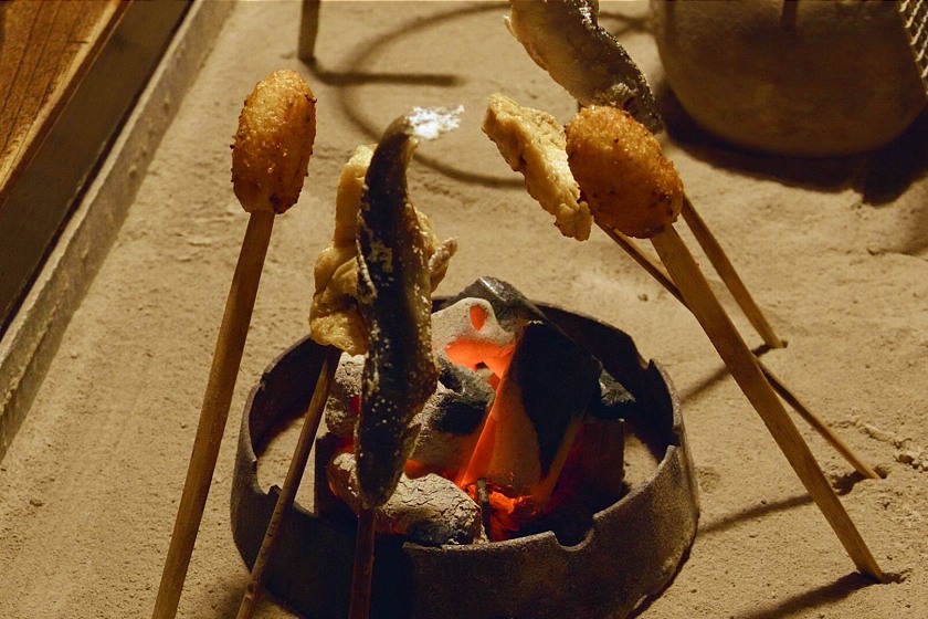 While filming our 4-day road trip across central Japan video, we spent a night in a beautiful ryokan in Okuhida. The wild animal furs on the tatami floors, the irori (traditional Japanese hearth) and the retro atmosphere definitely set the mood as soon as we arrived. The highlight definitely was the robatayaki dinner, where food is grilled on hot charcoal.