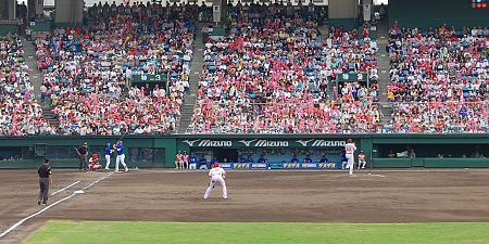 I was immediately impressed by both the friendliness and liveliness of the Hiroshima crowd. A sea of Carp hats and jerseys, they followed each play attentively. A small section of Yokohama supporters could be picked out as a blotch of blue in the otherwise sea of red. For the 7th inning stretch, balloons were passed around and everyone joined in the singing of the Carp theme, of which I was only able to catch the chorus (ca-pu, ca-pu, ca-pu Hiroshima, Hi-ro-shi-ma ca-pu). After the song the balloons were released, flying through the air and filling the sky, like a giant mass of the namesake fish.