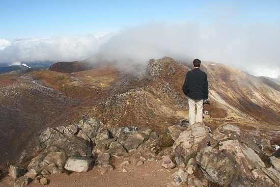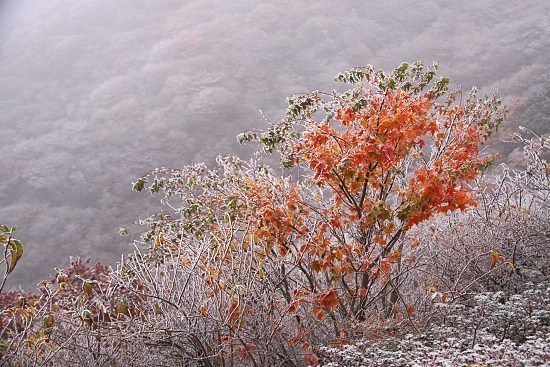 This year's number one highlight came when Schauwecker and I headed to the Kuju mountains in Kyushu to check out the area for the October 27, 2010 Autumn Color Report. Starting the day the sky was foggy and the weather was quite cold, and as we progressed further into the park the conditions worsened and there was even frost and snow on the ground. Though there were quite a few hikers at the park's entrance, further into the interior we saw almost no one. We reached the summit of Mount Kuju and sat down for a bite to eat and suddenly the fog began to clear up. All of a sudden we went from being able to see only a few feet in front of us to having almost our entire hike laid out in front of us. The view from the peak of the mountain was fantastic, making for an unforgettable experience.