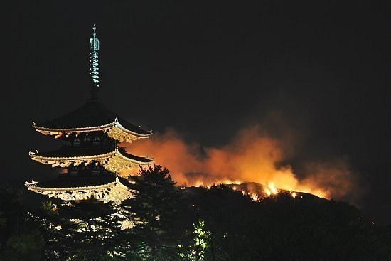 Taking place every year on the fourth Saturday of January, the Wakakusa Yamayaki Festival involves the burning of the hillside grass on Wakakusayama mountain. Although fireworks and some small activities also accompany the festivities, the actual burning of the mountain is far and away the day's most impressive event. The burning mountain can be seen throughout the city and gives spectators a vivid impression of a raging fire's tremendous destructive power.