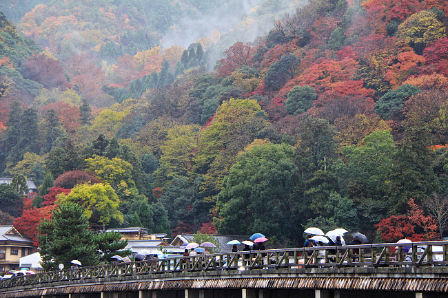 To check out some of Arashiyama's best fall color spots, I rented a bicycle near JR Saga-Arashiyama Station and pushed my bike through the crowds to the end Arashiyama's lively main shopping street to my first stop, the iconic Togetsukyo Bridge (in hindsight, I wouldn't recommend using a bike while exploring the crowded southern part of Arashiyama, though it was very handy in the relatively spread out northern areas). The hills behind the bridge were vibrant even in the rainy mist.
