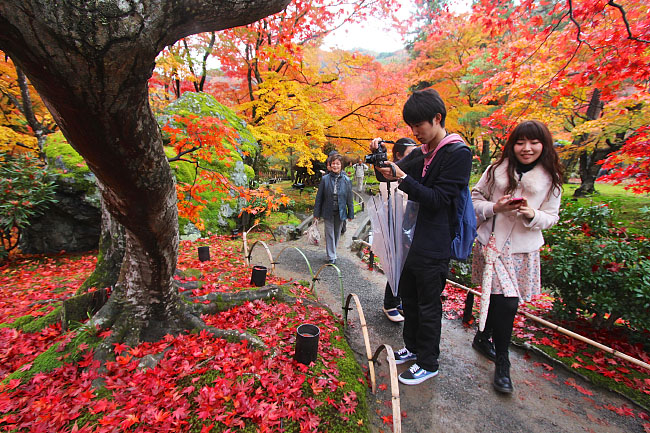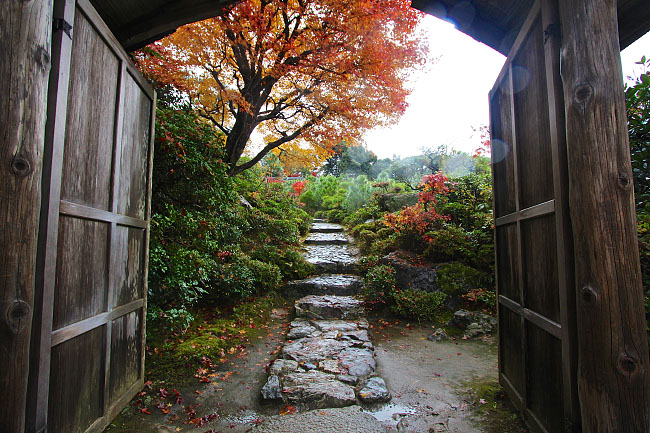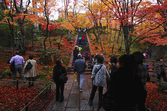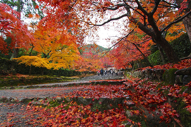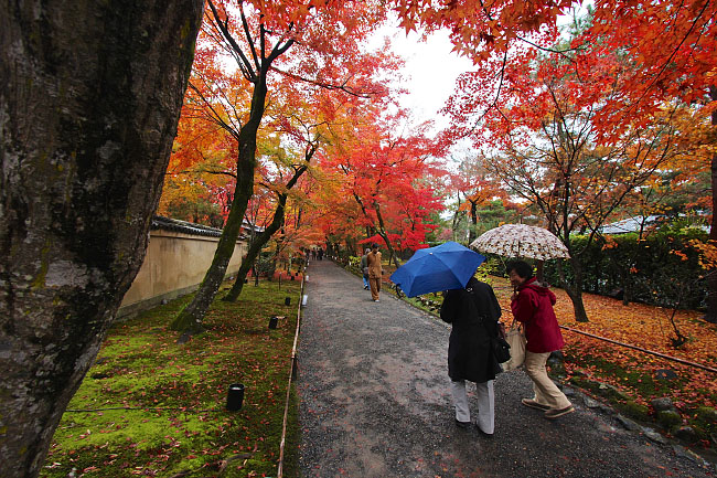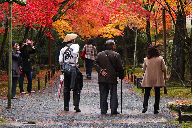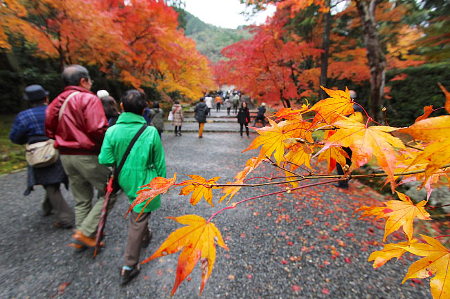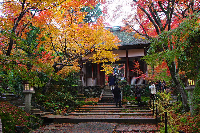 My final stop today was Nisonin Temple, just north of Jojakkoji. The leaves didn't disappoint here, either, especially around the main approach to the temple's famous front gate. Here too, I was surprised to see so many visitors on a rainy weekday like today. It made for a good reminder to always be prepared for crowds in Kyoto this time of year, advice I think might come in handy for any leaf watchers heading to Kansai this week.