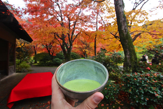 Just to the north of Tenryuji's back garden exit, Arashiyama's famous bamboo grove path led me west to Okochi Sanso, where I stopped for a break and some traditional green tea. Okochi Sanso is the former villa of a popular actor, which is now open the public to enjoy its lovely grounds, traditional buildings and teahouse, which happens to be situated next to some trees with nice fall leaves.