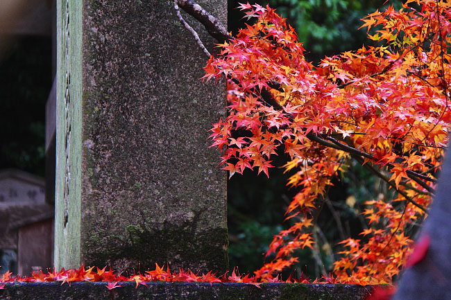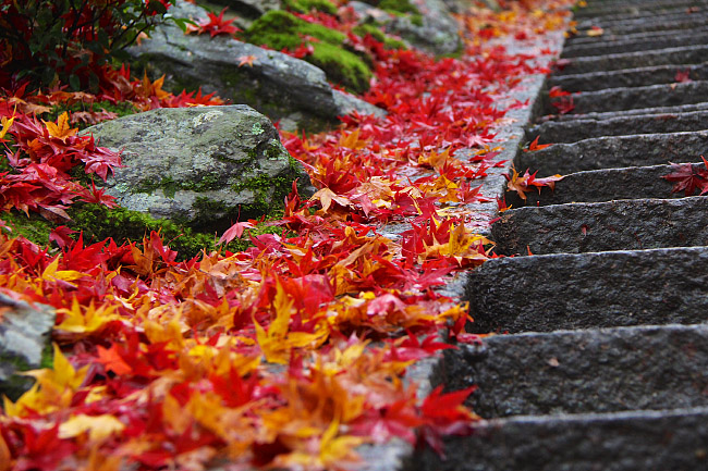 Tenryuji Temple, the largest and most famous of Arashiyama's temples, was my next destination. The temple's grounds host several gardens and buildings, and even a few sub-temples in and around the complex. While much of the grounds have very nice colors to show in the fall, one such sub-temple I discovered today is a knockout spot. The Hogonin Temple gardens are packed with momiji (Japanese maple) trees, which were all brilliant shades of red and yellow today. Much of the garden's paths are also lined by moss-covered rocks and earth, covered with a fresh blanket of brightly colored fallen leaves, making for some wonderful views.