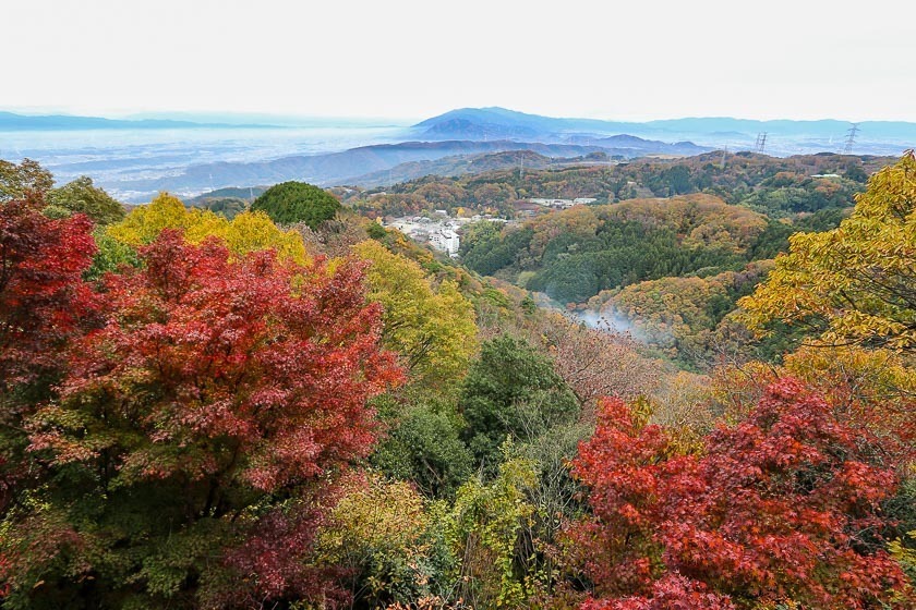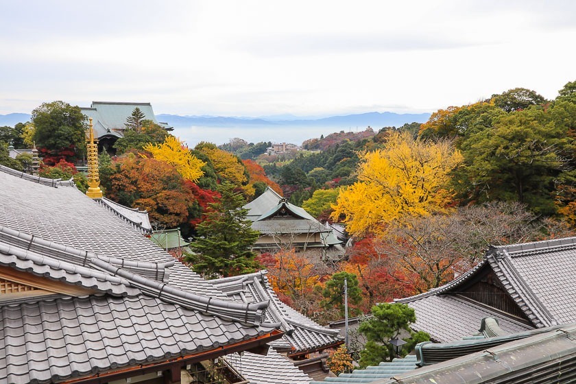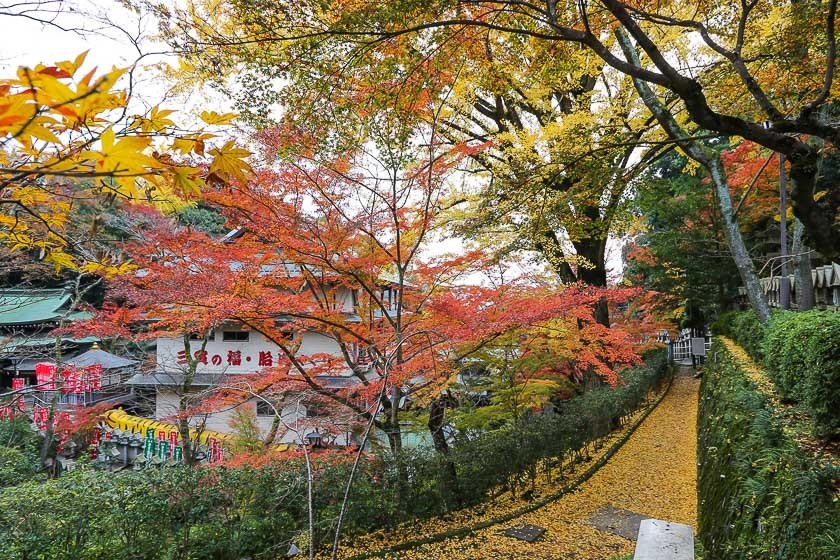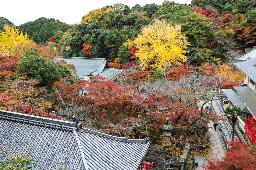 My first stop for today was Shigisan Chogosonshiji Temple in Nara Prefecture, not far from Horyuji Temple. The temple is located on Mount Shigi and was founded by Prince Shotoku about 1400 years ago. The temple grounds are quite spacious and the main hall looks down to the city below. Maple and ginkgo trees can be found on the grounds and they were showing off their best colors when I was there today. I expect the best viewing period to continue to through this weekend and possibly into early next week.