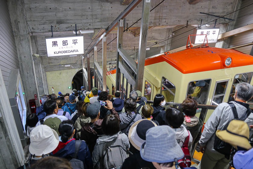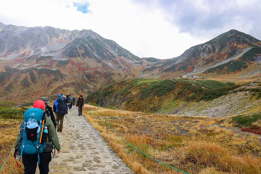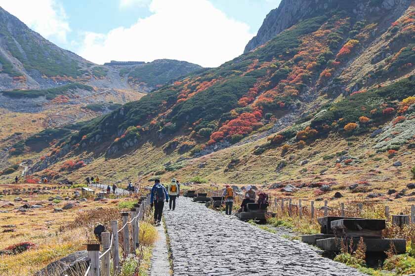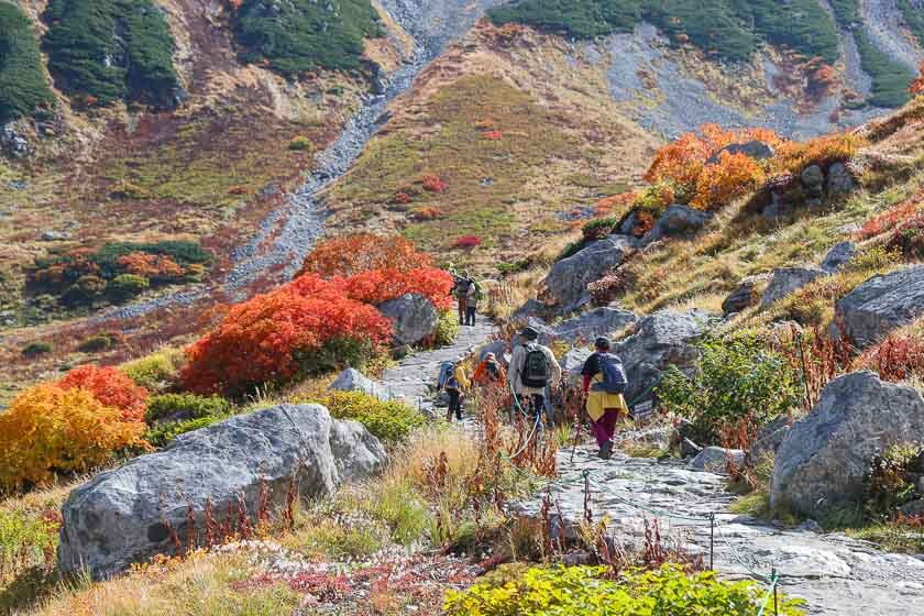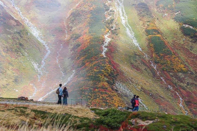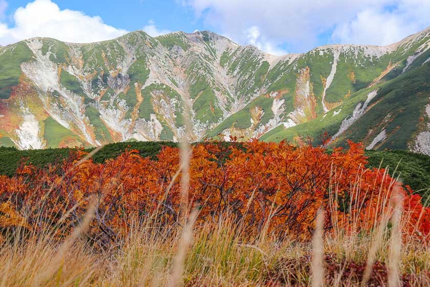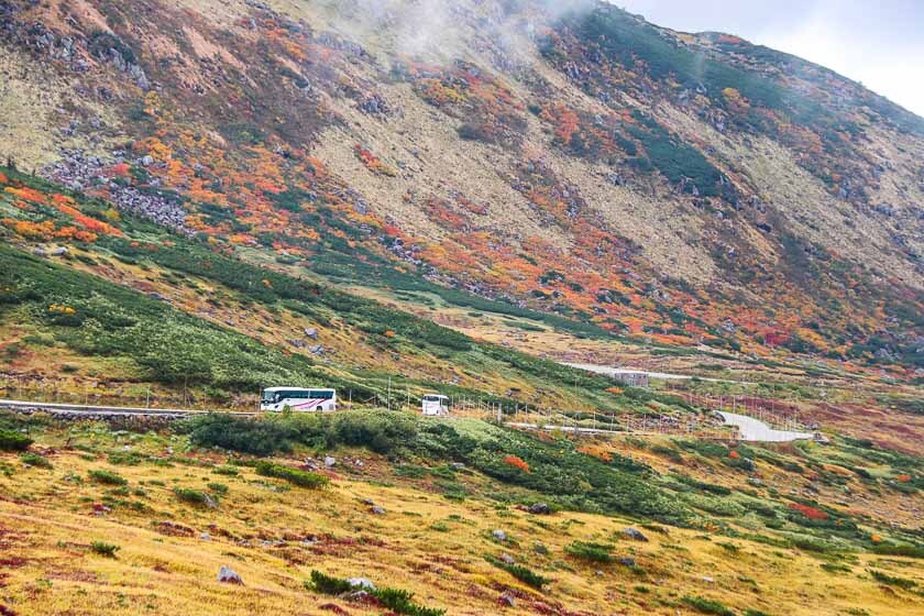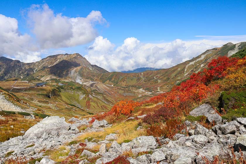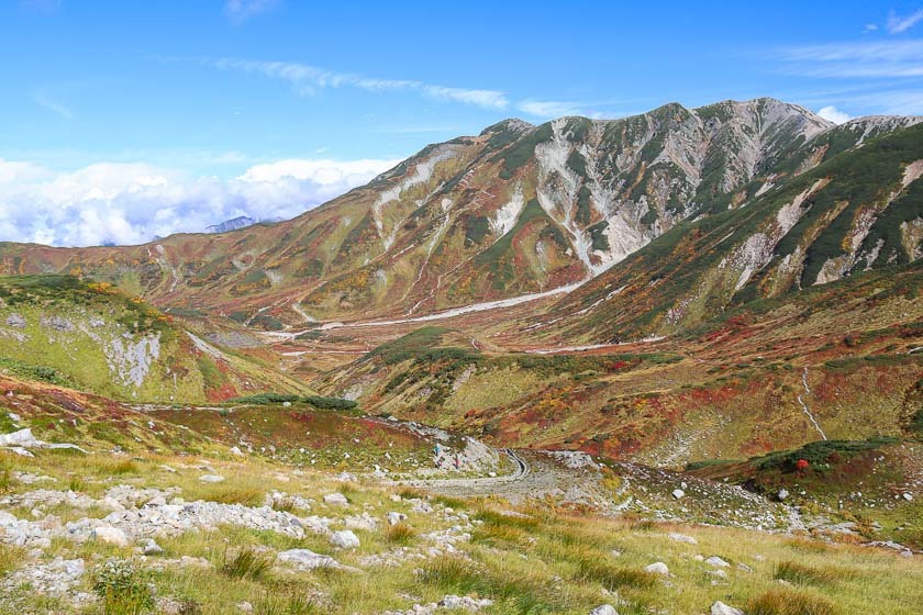 Located at 2450 meters, Murodo is the tallest point on the Tateyama Kurobe Alpine Route. It took me about 1.5 hours to get to there from Ogizawa on the Nagano side of the route, which involved taking a variety of transport like electric buses, ropeway and cable car. I arrived to the blazing orange and red foliage along the mountain slopes, which looked amazing under the blue skies. I expect the colors to remain at their best for the rest of this week and possibly into next week.