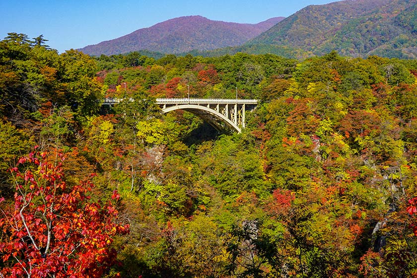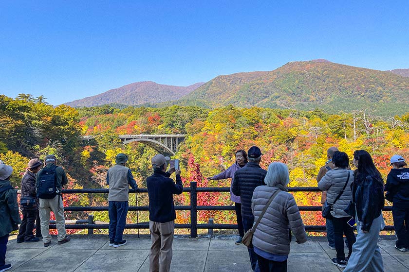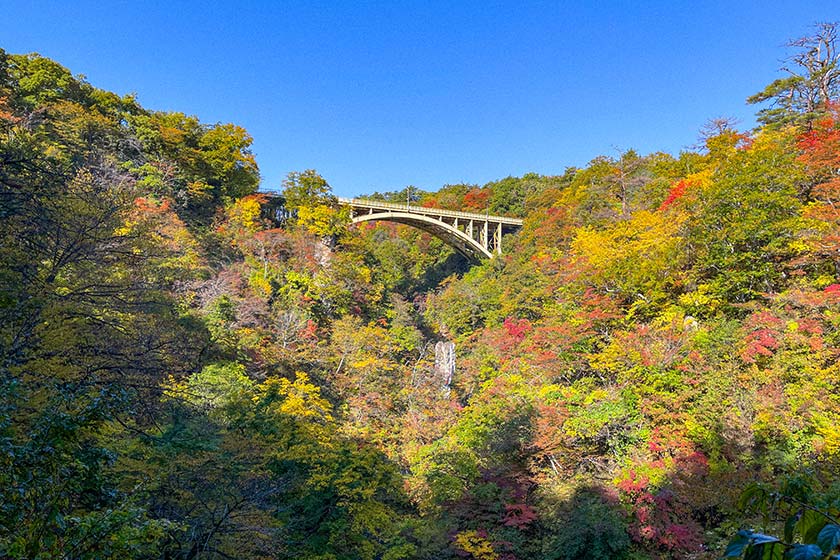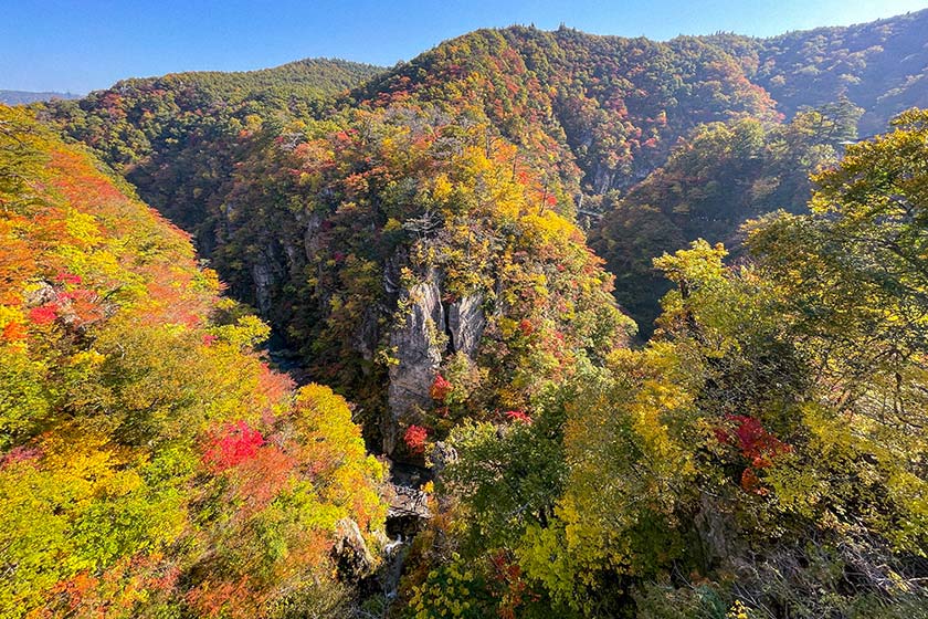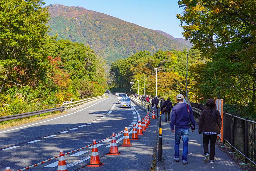 Naruko Gorge is best accessed by bus or on foot (about an hour) from Naruko Onsen Station on the JR Rikuu East Line. Until November 9, 2025, an autumn leaf bus service connects Naruko Onsen Station and the gorge. Take the bus from Naruko Onsen Station and get off at Narukokyo Nakayamadaira-guchi 鳴子峡中山平口 bus stop (15 minutes, 400 yen one way, one bus every 1-2 hours). The main sites to see autumn colors at Naruko Gorge are a short walking distance from that bus stop.