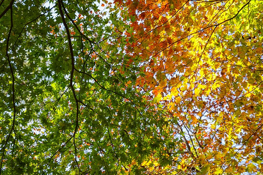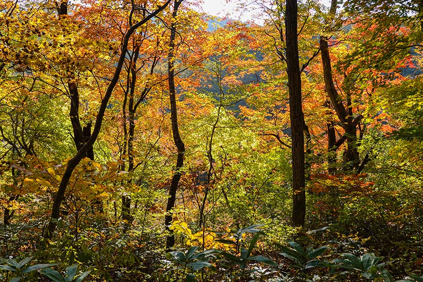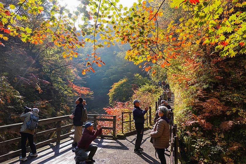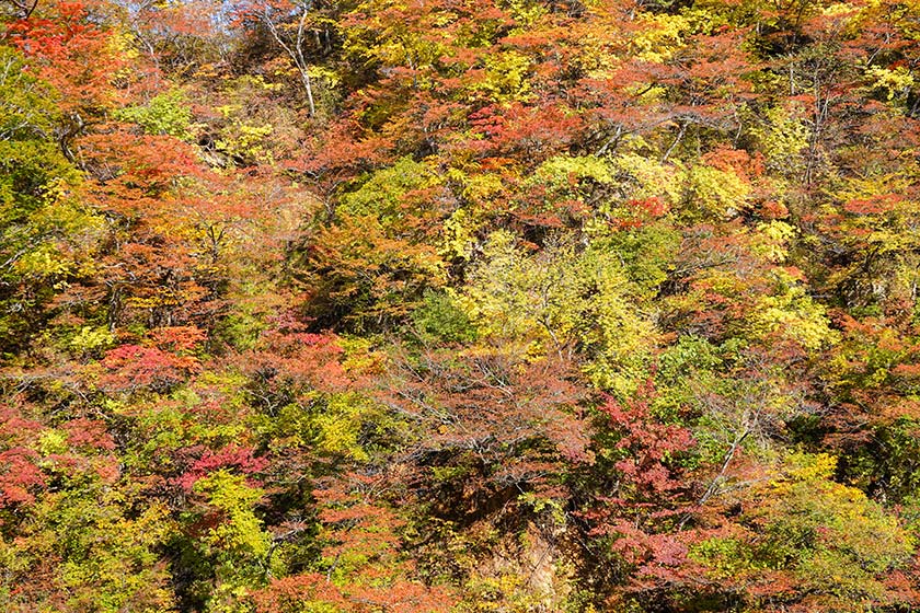 Yesterday, the color of the maple leaves at Yamadera Temple were just starting to change. Today, I continued with my autumn color reporting in northeastern Japan, and went to Naruko Gorge about 90 minutes from Sendai. The gorge is a well-known destination to see autumn colors, and I found the leaves had taken on attractive hues of red, yellow and orange. While already very attractive, I expect the colors to develop more intensity over the next few days, accordingly, the peak of the season should start by the first few days of November.