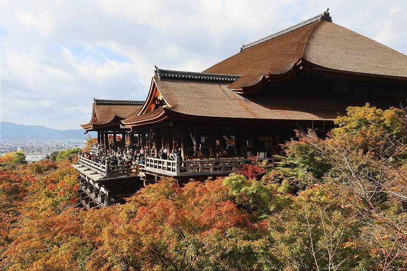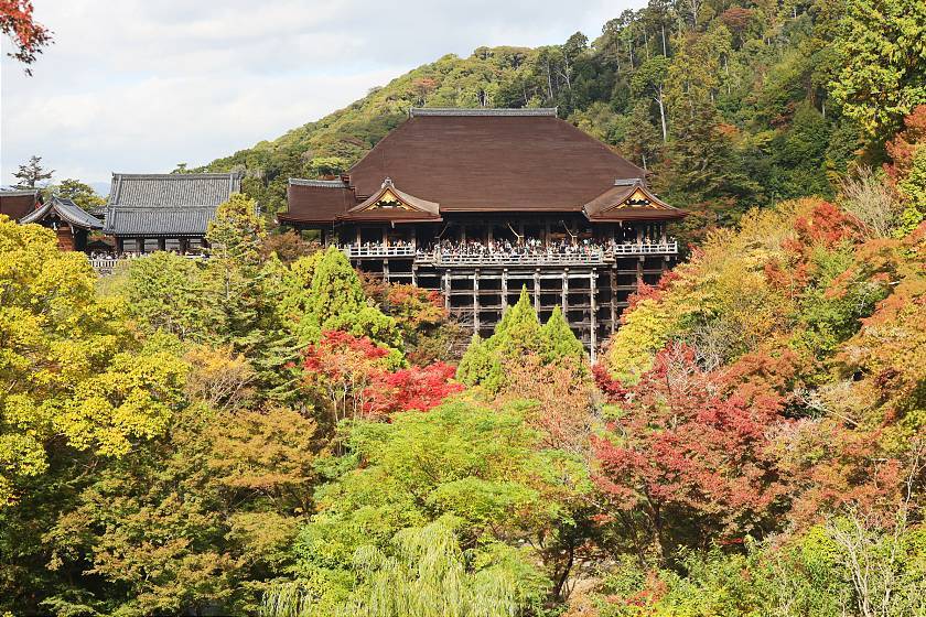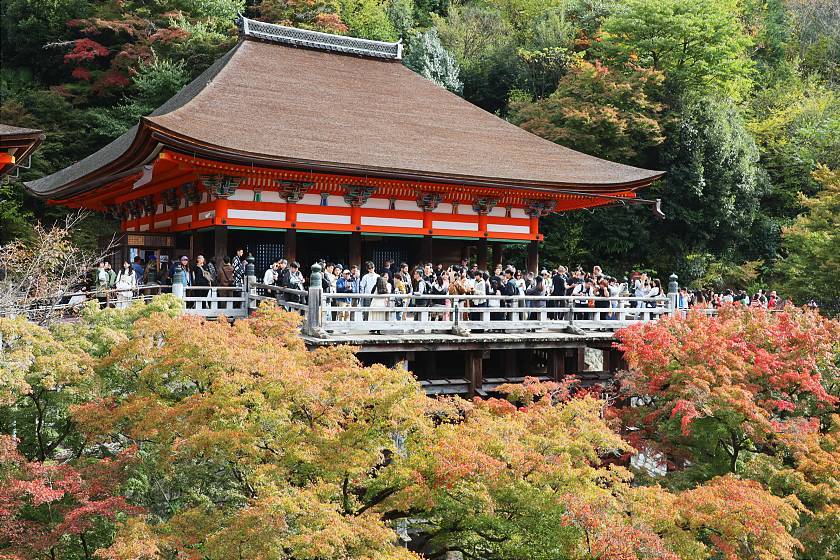 My second visit was to Kiyomizudera, located about two kilometers to the northeast where it overlooks the city from its perch on the slopes of Mount Otawa. Here again I saw a few patches of color - especially at the foot of the temple's famous wooden stage, which is often said to be the first to change - but overall things seemed to be at quite an early stage.