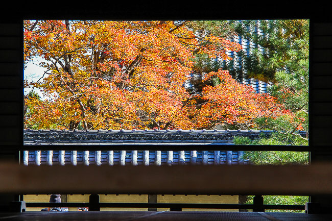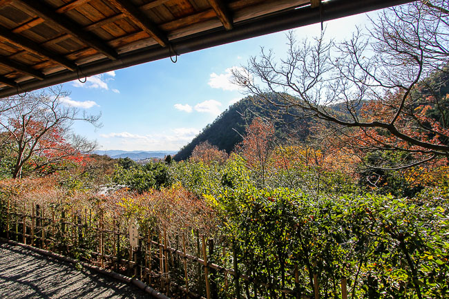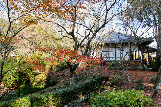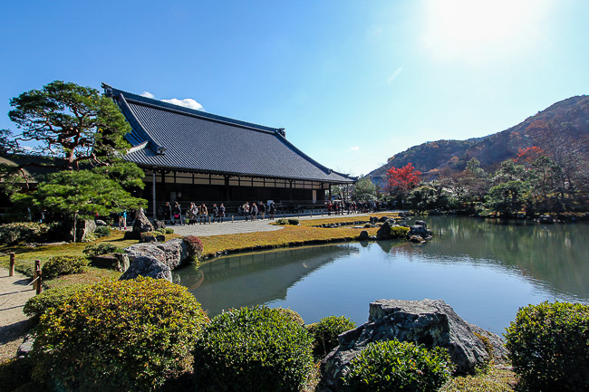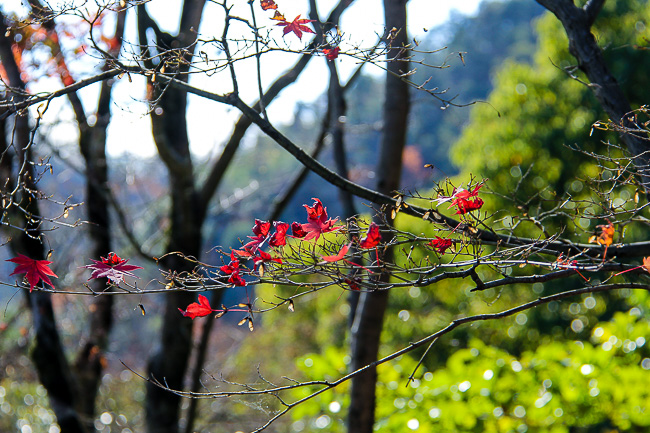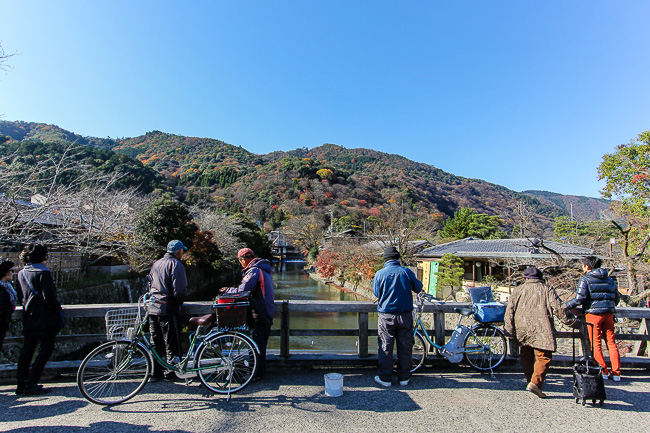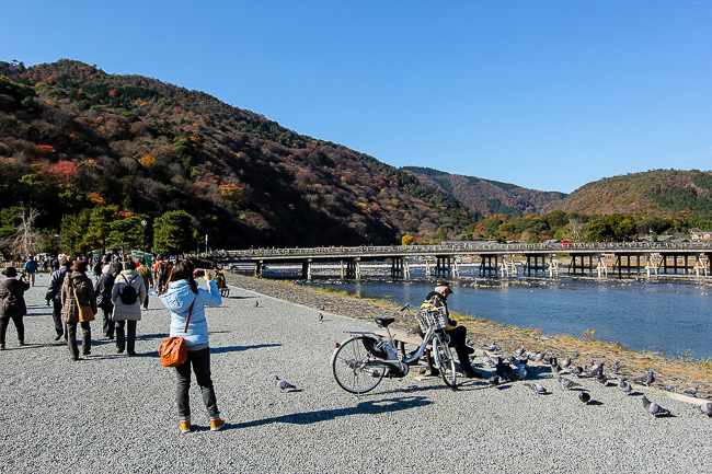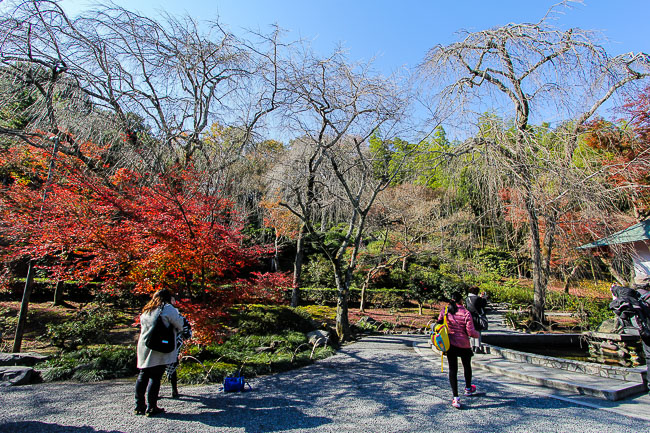 Arashiyama was my first stop of the day. The autumn colors near Togetsukyo Bridge were at their peak when Joe was there about a week ago. The fiery red trees on the hill behind the bridge have lost their leaves, making the hill look a little naked. Over at Tenryuji Temple, the colors were also past their peak with a few trees with red leaves on them, and needless to say, those trees drew the most crowds. Entry to the garden at Tenryuji Temple costs 500 yen, and entry to both garden and the interior of the temple costs 600 yen.