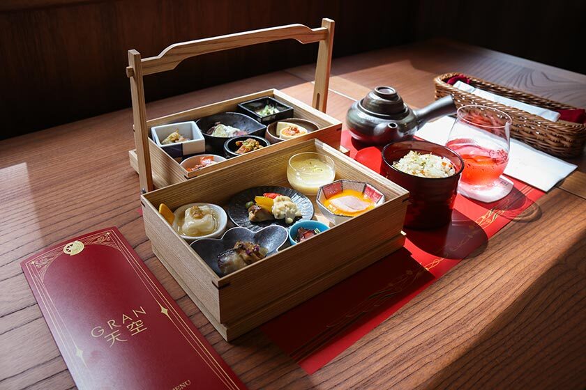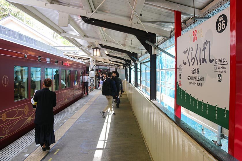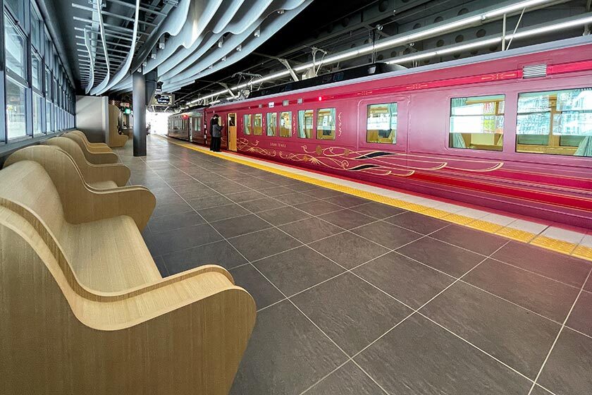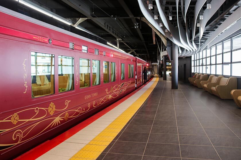 At Nankai Railway's Namba Station, the journey begins at the GRAN Tenku's dedicated platform, Platform 0 (zero). The dark tiles and wooden seats give an air of elegance, making it stand out from the rest of the train platforms. The GRAN Tenku comprises of four cars - three seating cars and one cafe car - and elevates the popular 90 minute journey with a range of luxury seating options.