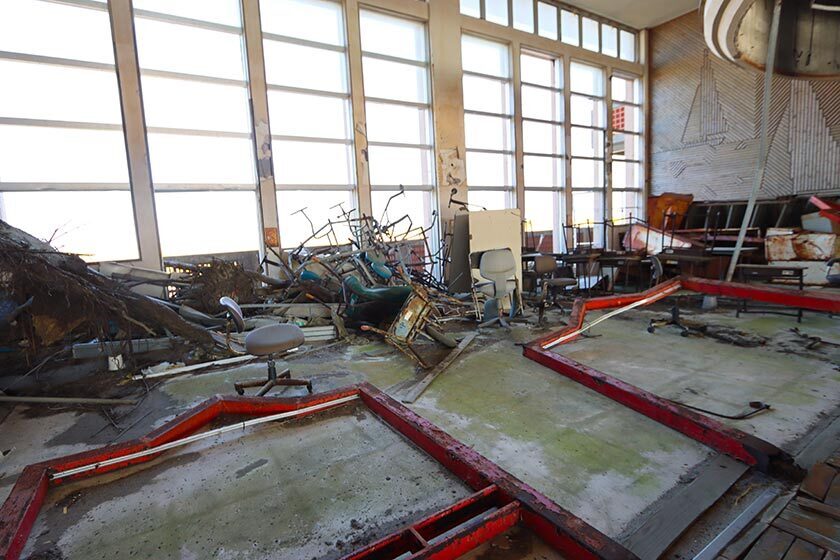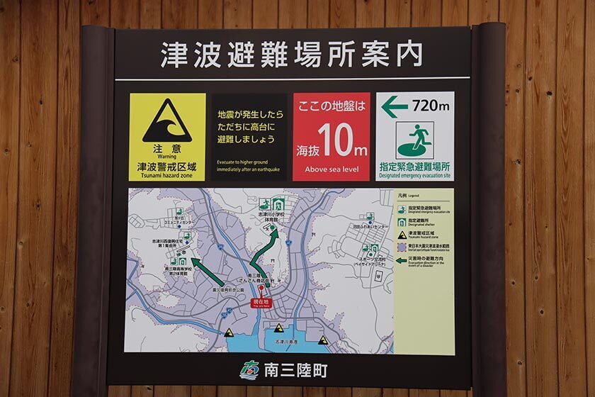 The tsunami was almost as high as the building (the blue sign marks the tsunami's height)