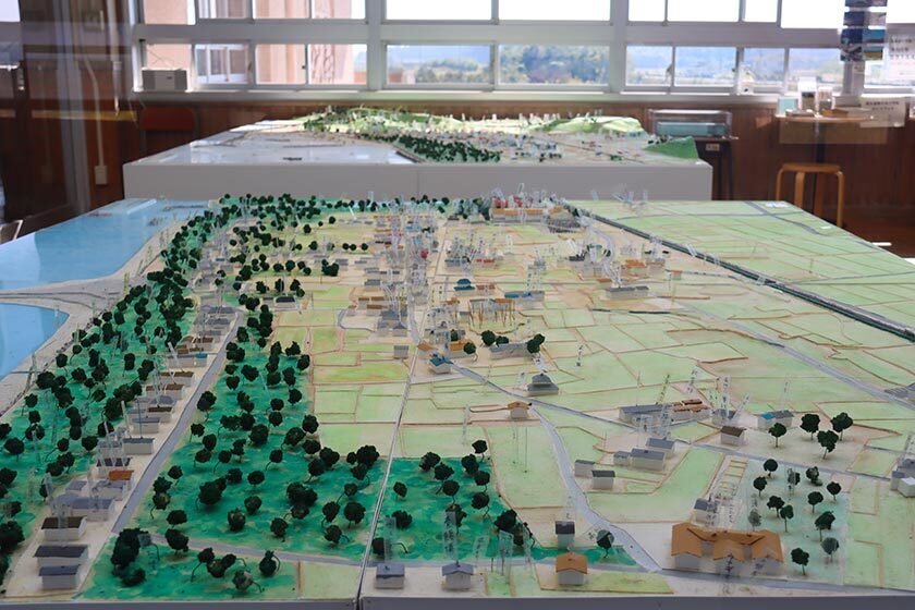 The residential districts surrounding the school - here recreated on two dioramas - were destroyed by the tsunami, claiming dozens of lives. They won't be rebuilt due to their proximity to the sea.