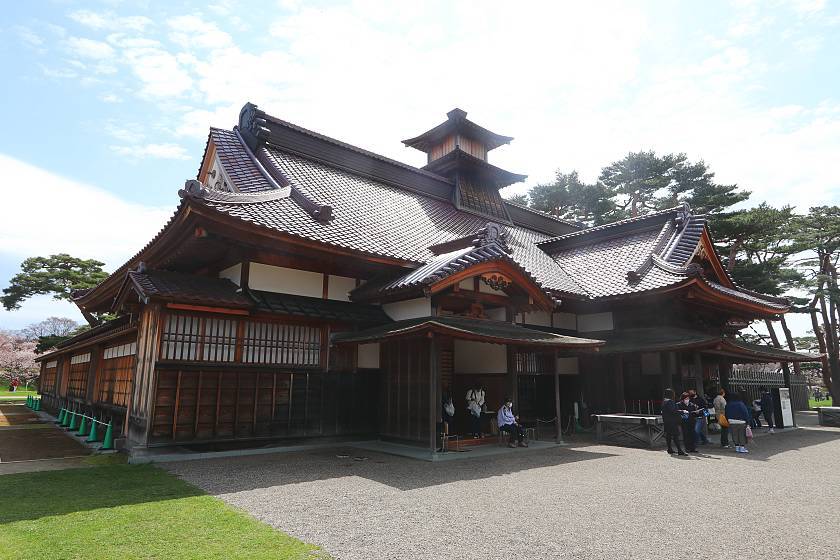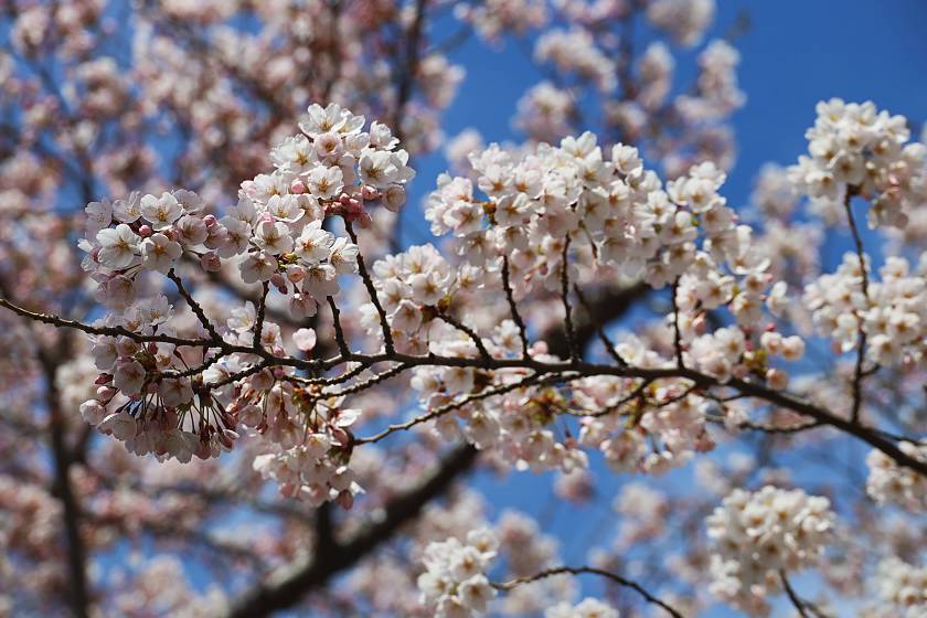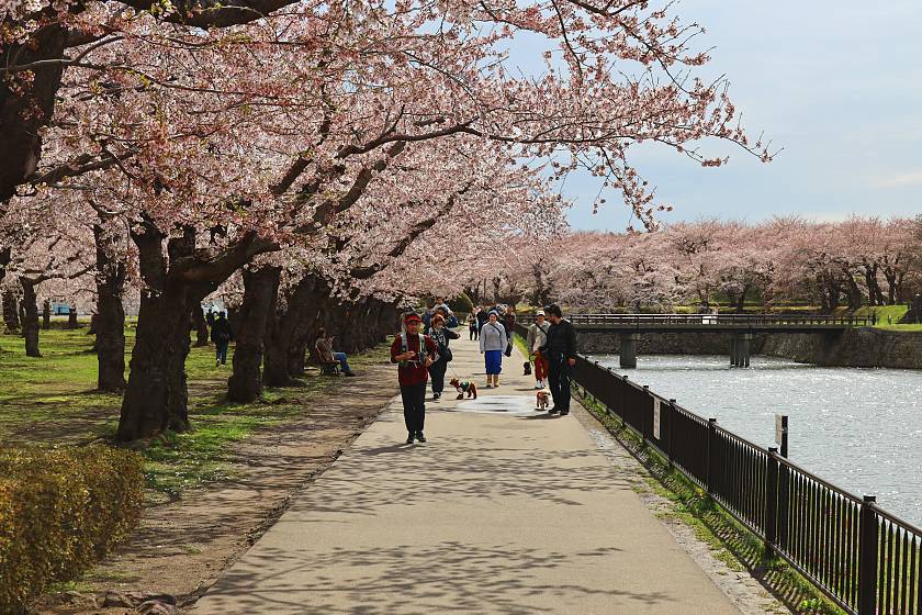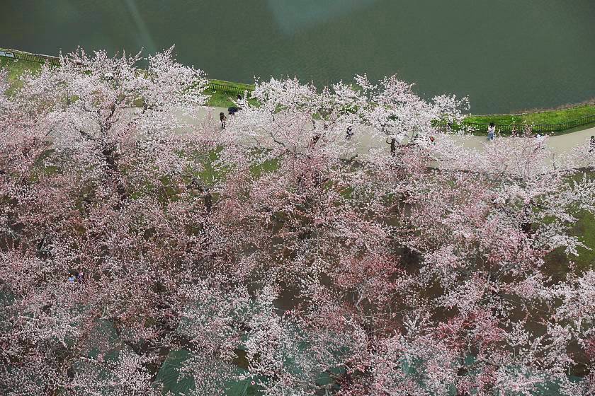 Inside, the cherry blossoom had only just reached full bloom, creating some wonderful scenes along its angled moats, groves and grassy spaces. Overall, the trees outside the moat looked just slightly more vibrant and well-developed, while many inside the old defenses looked to be about a day behind. Best viewing should last a few more days but may be cut short before the end of the coming week by forecasted strong wind and rain.