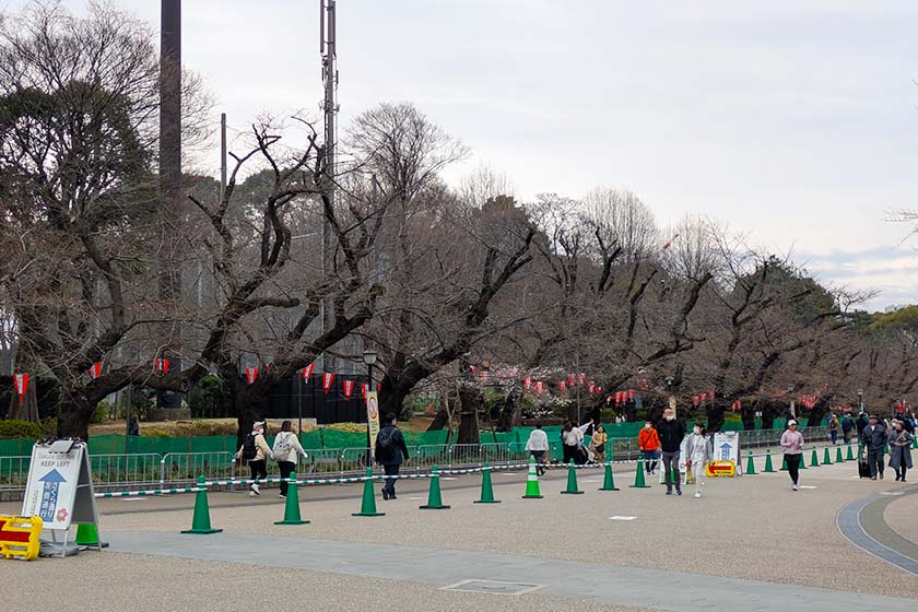 Ueno Park is already ready for the cherry blossom season with its food stalls and crowd control signs - now all it needs are the flowers! At the moment the overall look of the trees is somewhat bare from a distance, but upon a closer look I saw a good number of trees had their first flowers, though still very sparse. I expect Ueno Park to be in line with the overall Tokyo forecast, coming into its best viewing from around March 25.