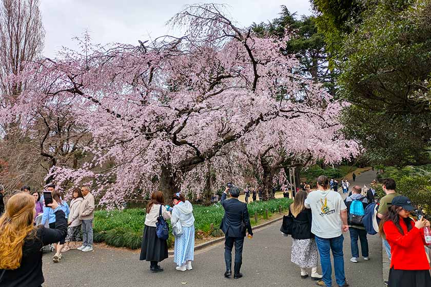 I expect the Somei Yoshino at Shinjuku Gyoen not to reach their best viewing until a couple of days after Ueno Park, putting it at around March 27. Note that this year reservations are required to enter the park on the weekends of March 28-29 and April 4-5 between 10am and 4pm.