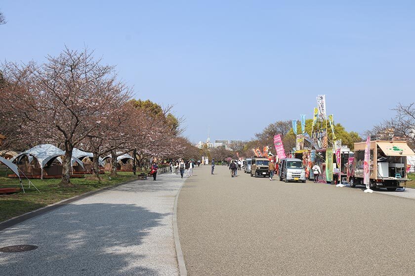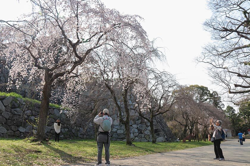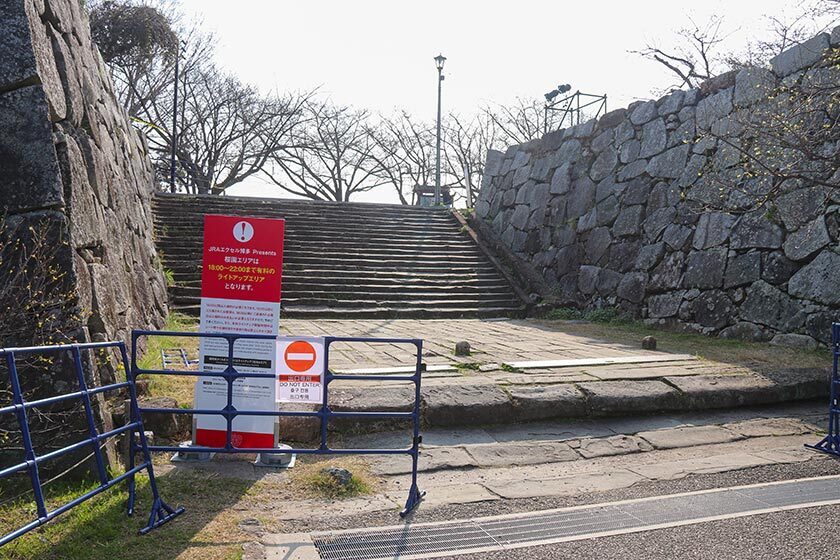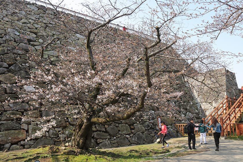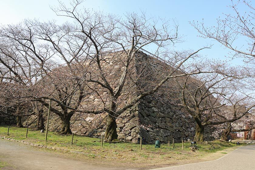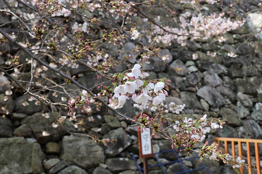 Until April 5, there is a cherry blossom festival on the former castle grounds. The area below the main keep foundations is free to enter during the day, but costs 600 yen per person from 18:00 to 22:00, during which time the trees are illuminated. Food and drink stalls are also available on the castle grounds.