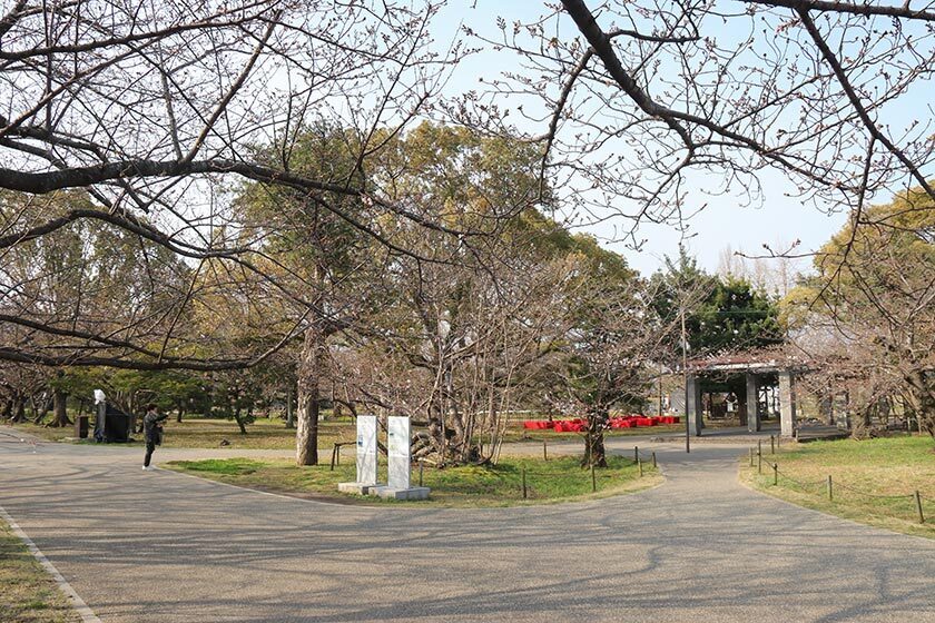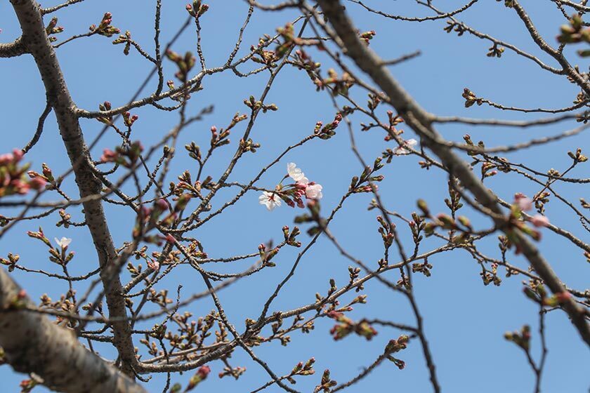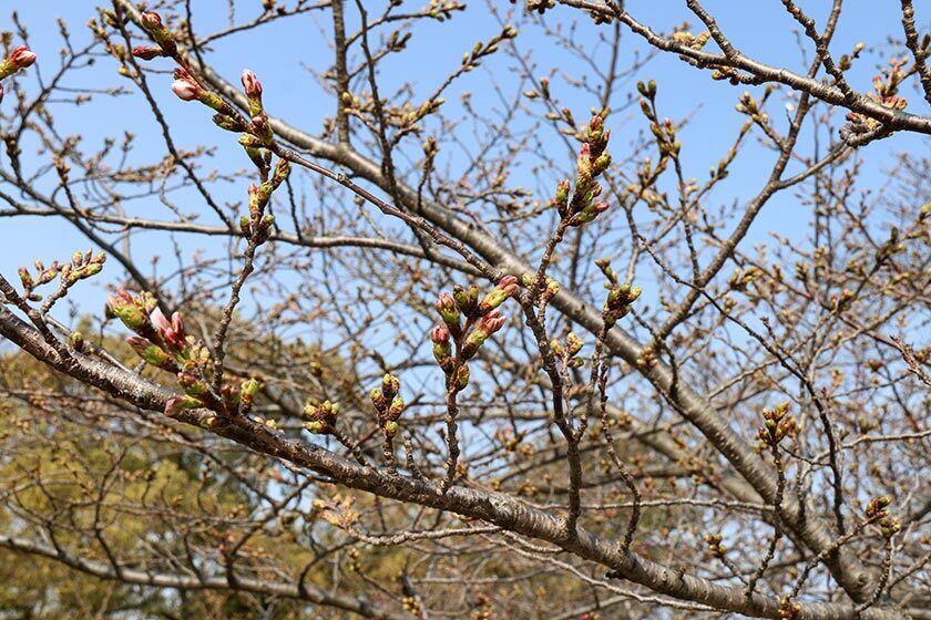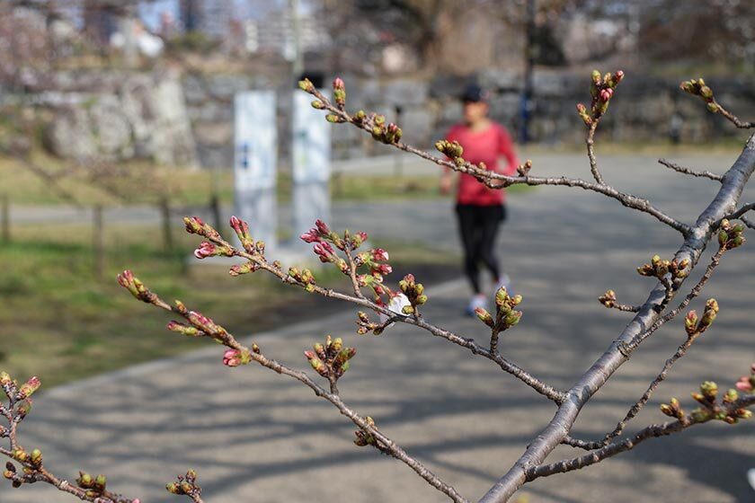 Fukuoka Castle Ruins is a popular cherry blossom viewing spot in Fukuoka. I visited early in the morning and found more closed buds than open blossoms. However, warm temperatures are forecast for the next few days, which should give the closed buds all the encouragement they need to open. I estimate the best viewing in Fukuoka to start from around March 31 and continue for a week or so barring inclement weather.