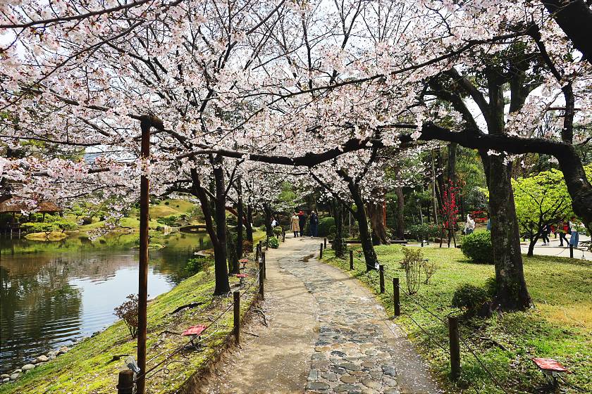 While also still very attractive, overall the blossoms seemed a few days ahead of those at the Peace Park and had suffered a bit more in the rain, leaving scatterings of petals here and there, and I would expect the period of best viewing to accordingly close a little earlier.