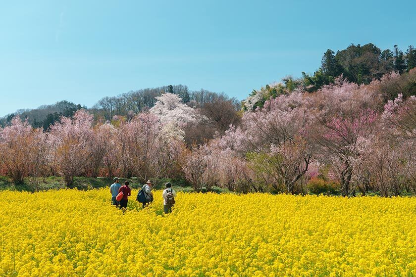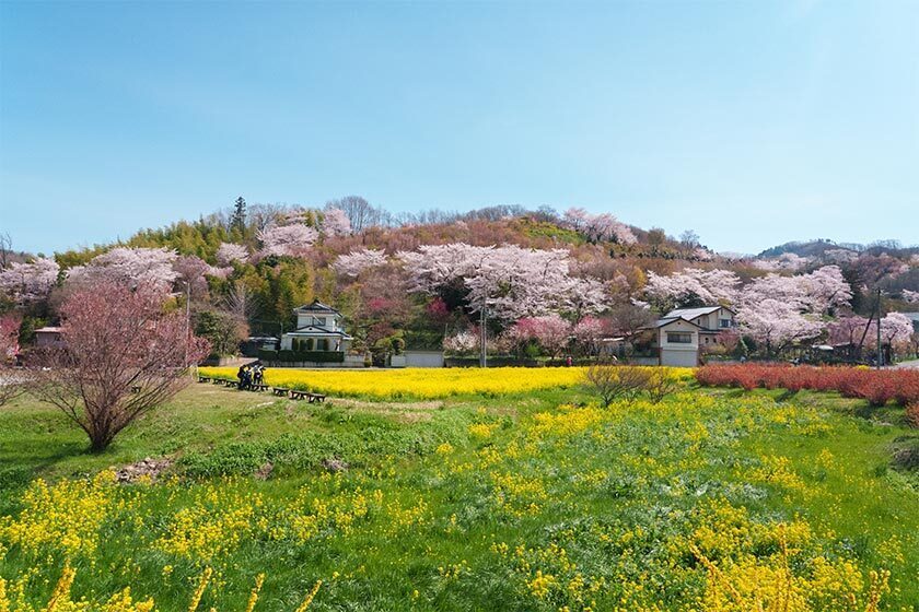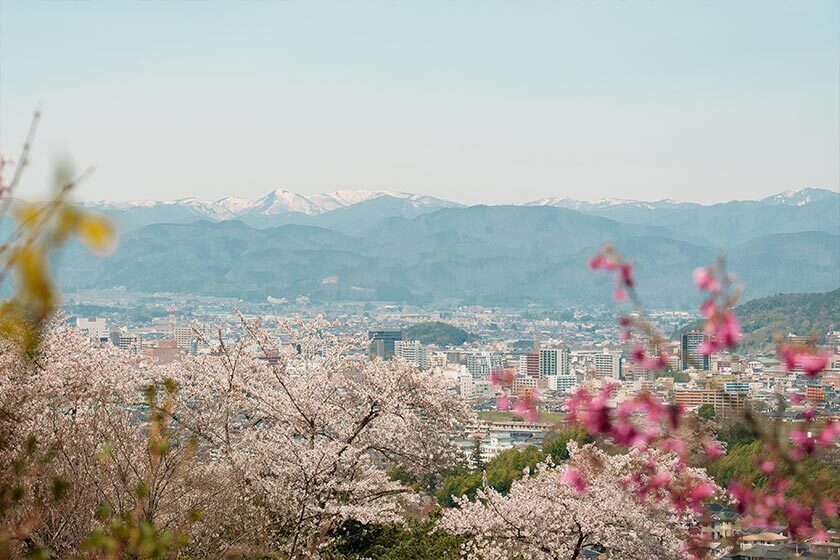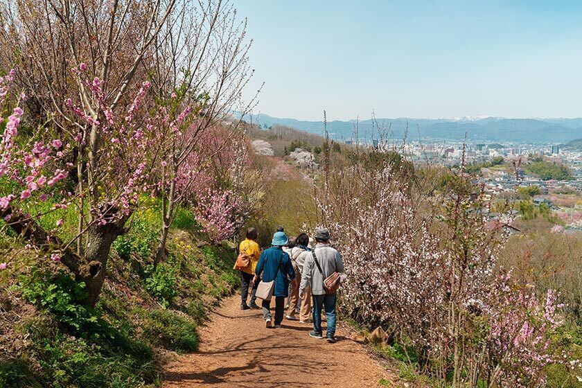 From the bus stop, it takes around 10 minutes to walk to the park entrance. There are three different courses that loop around the mountain, taking 30, 40, and 60 minutes respectively. You gain elevation quite quickly, so even if you don't make it all the way to the top on the 60-minute course, you'll still get great views over the flowering hills. One of the other highlights for me was the cherry blossoms against the snowy background of the Azuma Mountains.