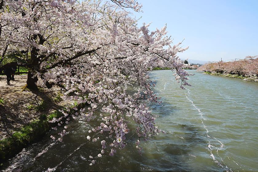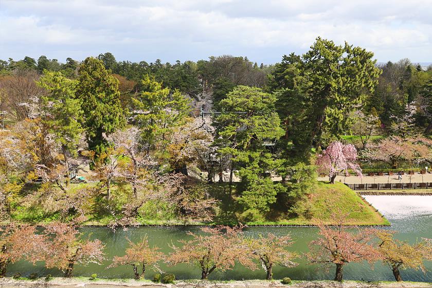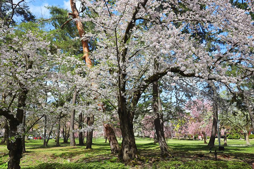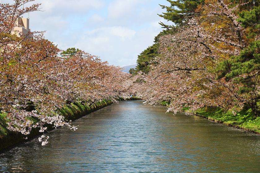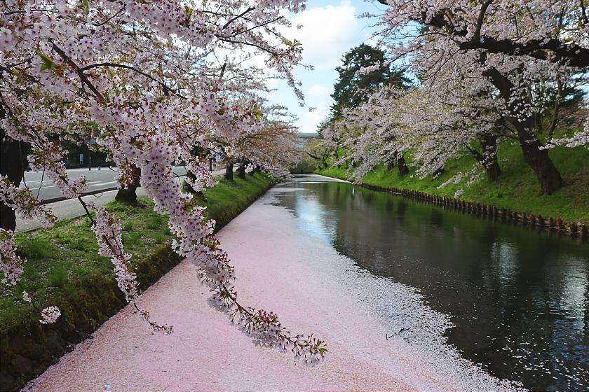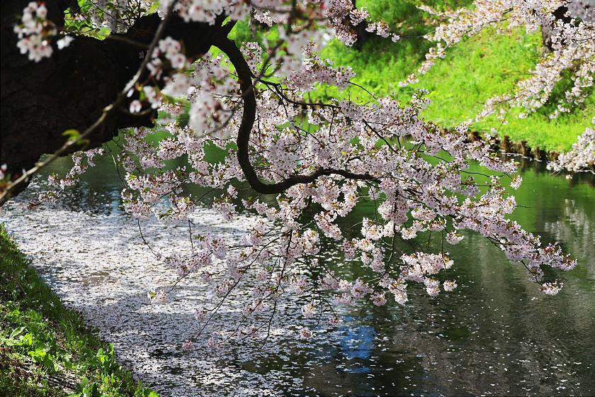 My first glimpse of blossom was along the outer moats at the edge of the park, which are lined on both sides with cherry blossom trees that tend to reach their peak just ahead of the ones inside. At the time of my visit, these were still attractive in places but overall were already looking quite bare - especially along the southern end near Hirosaki City Hall, where strong gusts of wind were creating little blizzards of petals.