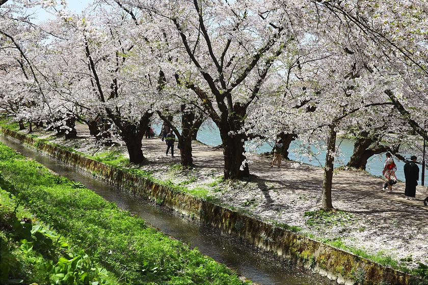 The trees inside the park were noticeably fuller and more attractive, especially in spots with some shelter from the wind. In the highest part - the paid area surrounding the castle keep - the most typical Somei Yoshino type was already thinning out while a later-blooming type of pink weeping blossoms was still striking and vibrant. Another highlight was along the "sakura tunnel", where rows of blossoming trees form a canopy of petals over a causeway running alongside the western moat - this was especially beautiful, even as it continued to lose petals to the strong wind.