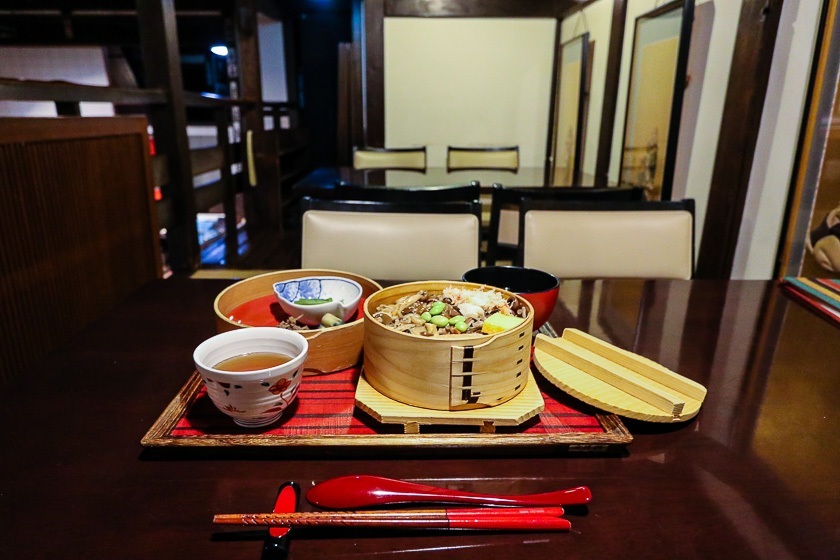 The Aizu Region is known for its high-quality sake, and a number of local labels have won both international and domestic competitions. A short walk from the north exit of Tsuruga Castle is the Aizu Miyaizumi Brewery, one of the numerous breweries in the region, which offers free sake tasting at their shop. Lunch was at an old established restaurant, Takino, that specializes in an Aizu delicacy called wappa-meshi which is rice and other local ingredients steamed in a wooden container.