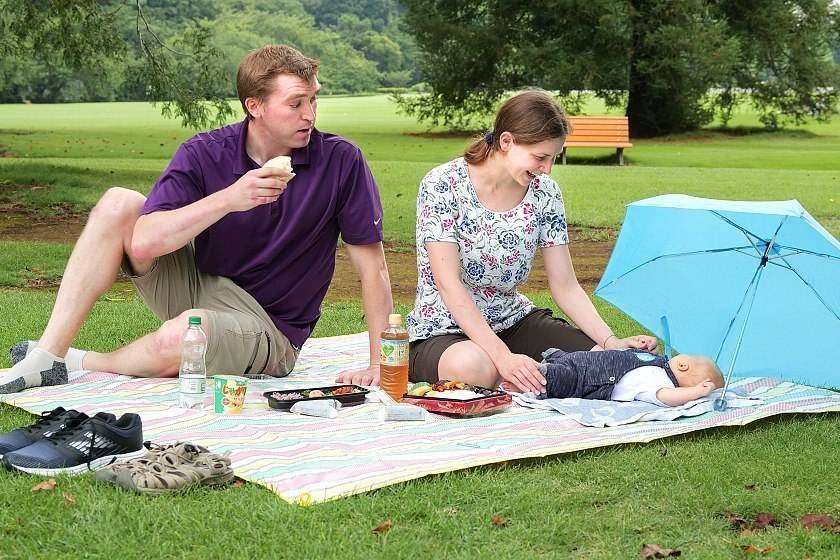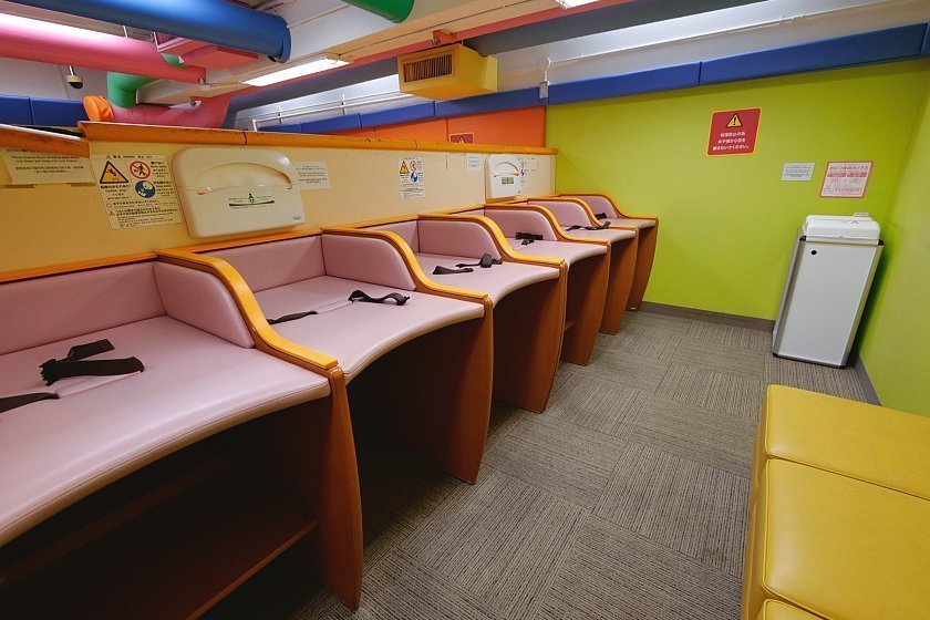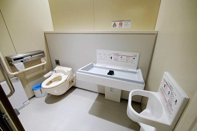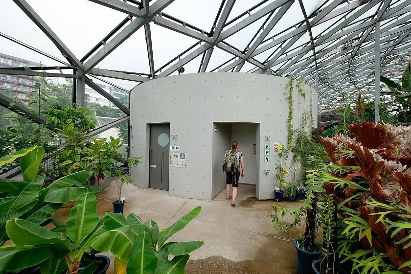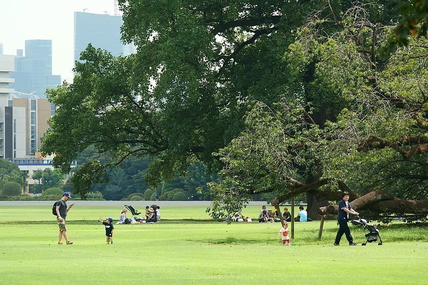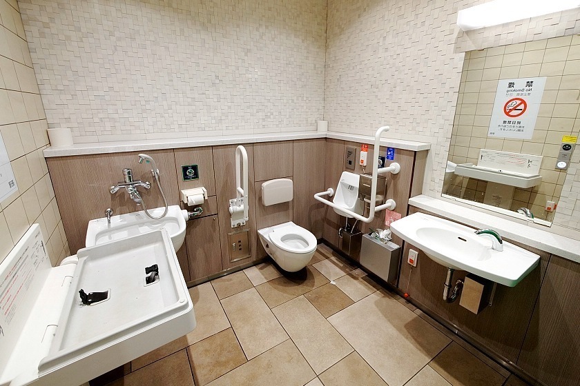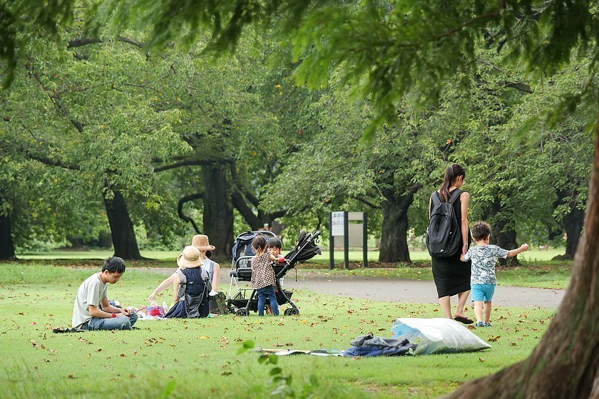 Shinjuku Gyoen is one of the largest parks in Tokyo and features three different garden styles: a traditional Japanese garden, French garden and English lawn garden. While all are beautiful and worth exploring, the English lawn garden is the true gem for families with young children. There you can sit on the expansive lawns under the shade of one of the many trees while your kids run and play within sight. If they happen to cry or fuss the sound will dissipate into the open grounds. Our son is too young for running around but he enjoyed lying down on our picnic mat, soaking up the sounds of nature while a pleasant breeze kept us all comfortable. It turned out to be a relaxing lunch and break from the city bustle. Next we took a walk through the Japanese garden and stopped at the restroom next to Eco House Restaurant Yurinoki. This is one of two restrooms within the park with a nursing space as well as a changing table. The other is located in the park's greenhouse. While both are modest in nature, I still appreciated the space being provided. Most of the other restrooms throughout the park also have changing tables and the free park maps you can grab as you enter the park make it clear where they are all located.