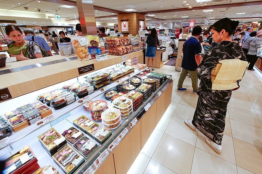 We made our way back towards Shinjuku Station, stopping at the Keio Department Store. My research of the station area taught me that the 7th floor, which sells children's clothes and goods, has a nursing space called "Baby's Room" and I was not disappointed. The space provided very comfortable and curtain-separated private seats for nursing in the back. Besides that there was a small play area for infants and toddlers, changing tables, strollers for use in the department store, vending machines with healthy drinks and crackers for kids, high chairs and even a hot water dispenser and microwave for parents who may need to prepare a bottle. After using that free facility, we headed to the semi basement floor of the building where a vast variety of pre-prepared food is sold. With much deliberation we bought a couple of delicious looking lunchbox bento and a few other snacks for a picnic lunch at Shinjuku Gyoen.