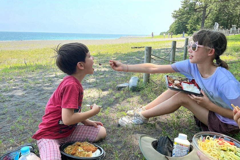 Nearby Shizuoka City, just a bit off the expressway, is Miho Beach, which features views of Mt. Fuji and a pine forest called Miho no Matsubara. We found a shop that sells bento boxes along the way, so everyone got to choose one they liked, then we had a good time eating them on the beach.