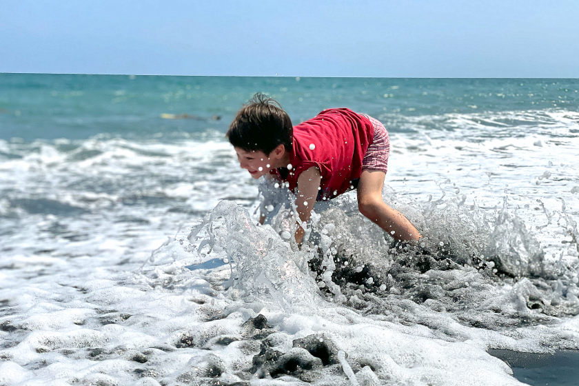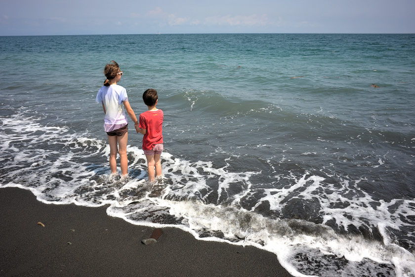 Unfortunately the day was hazy and we couldn't see Mt. Fuji well, but we had a nice time walking under the pines, and the kids were very excited for the beach. We didn't have enough time to swim, but that didn't stop the kids from getting very wet! We finally dragged them away from the water and back to the car, and after a change of clothing got back to driving to our main destination.