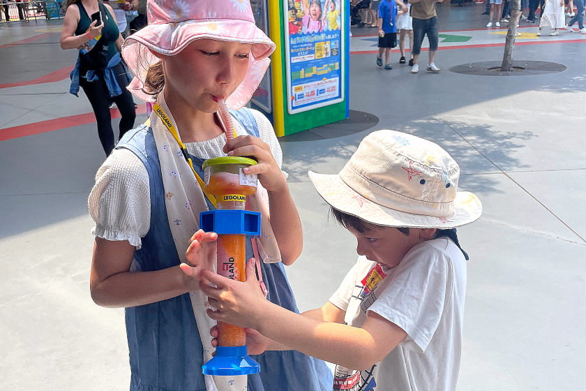 The forecast was for a hot day, and we had made a reservation that morning for the Splash Pad area in the park, so I had brought swimsuits to change into and towels for that. I stuck all that in a locker a the entrance for later, and meanwhile the kids clamored for a souvenir smoothie cup. It was shaped like the Legoland tower, and you could refill it at the smoothie stands around the park, so I gave in on that one. Despite the high price of the cup, I probably should have gotten them each one to prevent the fighting. But the smoothie flavors were good, and refreshing in the weather.