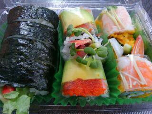 There are many kind of sushi roll, a duck, a salmon, a cheese, a green onion...like that. When I bought them, a store cleak asked me " Do you want them to be cut ?" I hope so, she cut them ease of eating.