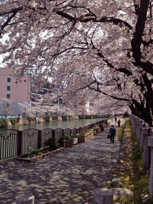 last year's cherry blossoms along the river bank of Fukuoka Chuo Koen (Central Park)