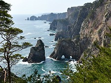 The Kitayamazaki Coast is an eight kilometer long stretch of coastline in northern Iwate Prefecture featuring sheer, 150-200 meter high cliffs. The coast is best seen from the Kitayamazaki Observatory, a park at the northern end of the coastline.