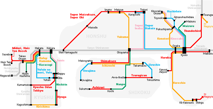 Several train companies in Japan operate limited express trains. In particular, the JR companies are operating a large number of limited express trains across Japan (see map below), especially between major stations and cities not connected to the shinkansen network.