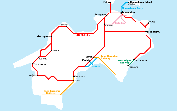 Below is a map of train and ferry lines, which can be used with the All Shikoku Rail Pass: