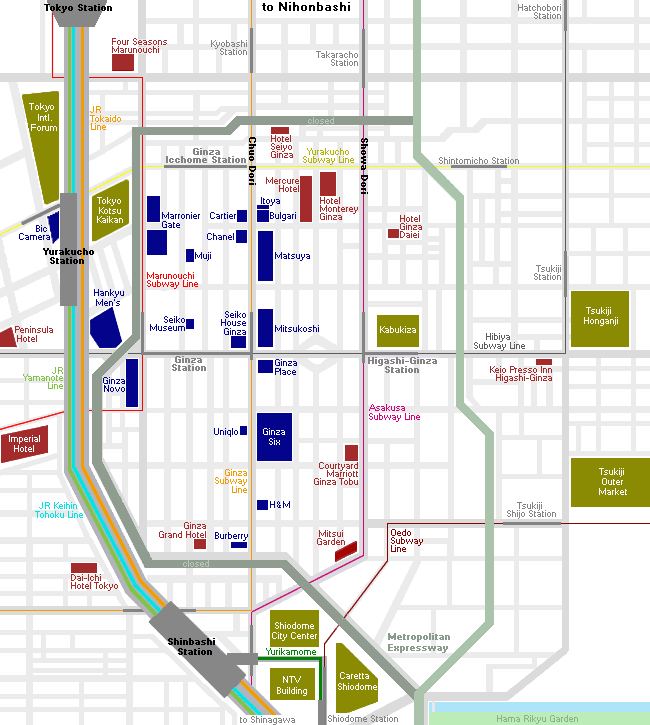 The most convenient stations for accessing the Ginza district are Ginza Station on the Hibiya, Marunouchi and Ginza Subway Lines and Yurakucho Station on the JR Yamanote Line, JR Keihin-Tohoku Line and Yurakucho Subway Line.