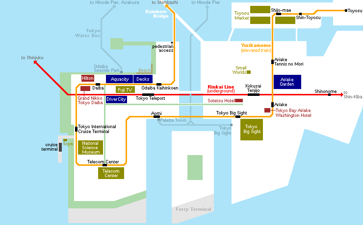 The ride from Shinjuku to Tokyo Teleport Station on Odaiba takes 25 minutes and costs 520 yen. Note that the Japan Rail Pass, Seishun 18 Kippu and similar JR tickets are not valid on the Rinkai Line between Osaki and Shin-Kiba, even though the line is served by JR trains. An exception is the JR Tokyo Wide Pass, which fully covers the Rinkai Line.