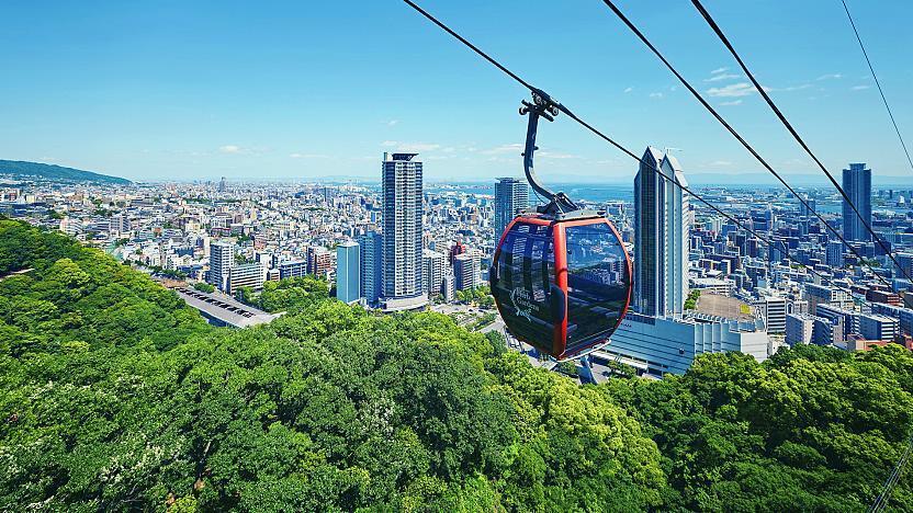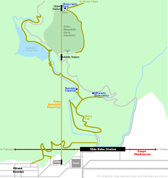 Kobe Nunobiki Ropeway (神戸布引ロープウェイ) is one of three services that lifts tourists up the southern slopes of the Rokko mountain chain. The ropeway departs from next to Shin-Kobe Station, Kobe's shinkansen station. As it ascends, it passes by the Nunobiki Waterfall and the Kobe Nunobiki Herb Gardens, giving a nice aerial view of both. The highlight of the ride lies in the observation deck located just beside the top station, which offers spectacular views of Kobe and is a popular night view spot.