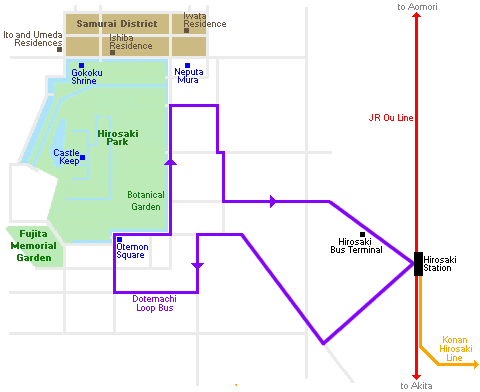 Neputa Mura is located beside the northeast corner of Hirosaki Park. The closest stop on the Dotemachi Loop Bus is "Bunka Center-mae", a five minute walk away. Another bus loop line, the Tamenobu Loop Bus, serves the closer "Neputa Mura" bus stop, but it operates considerably less frequently than the Dotemachi Loop Bus and not at all during the winter.