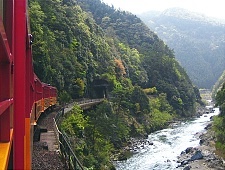 The small trains on the Keifuku Arashiyama Line connect Arashiyama with Omiya Station at the intersection of Shijo Street and Omiya Street in central Kyoto (20 minutes, 250 yen). Keifuku Railway also provides access to Kitanohakubaicho Station in northern Kyoto, not far from Kinkakuji, Ryoanji and Ninnaji temples (20-30 minutes, 250 yen). One transfer of trains is required along the way. Keifuku Arashiyama Station is located in the very center of Arashiyama.