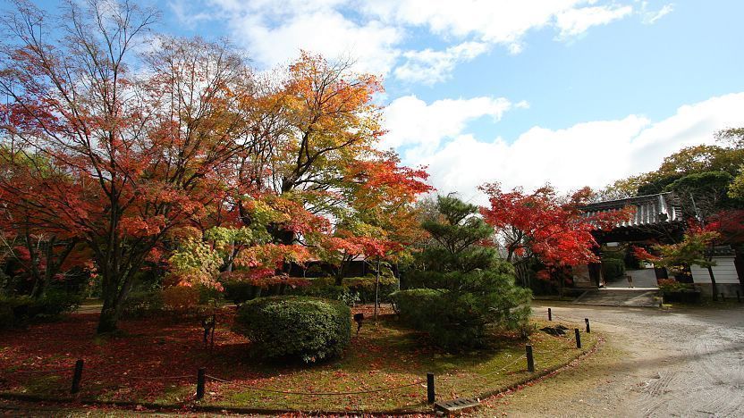 Next to the mound stands the Seiryuden temple hall which houses a painting of the fearsome Buddhist deity Fudo Myoo, who is depicted holding a sword and rope, surrounded by flames. The painting is an important object of worship of Shorenin Temple and a national treasure. A reproduction is on display inside the hall.