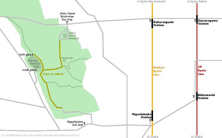 The northern starting point of the Take no Michi can be reached in a 20 minute walk from Rakusaiguchi Station along the Hankyu Kyoto Line (15 minutes, 200 yen one way from Kyoto-Kawaramachi Station in central Kyoto) or in a 30 minute walk from Katsuragawa Station along the JR Kyoto Line (6 minutes, 180 yen one way from Kyoto Station). The walk can be cut short by taking a bus from either station to Muko Kaisei Byoin-mae bus stop (向日回生病院前, 3-6 minutes, 190 yen one way).