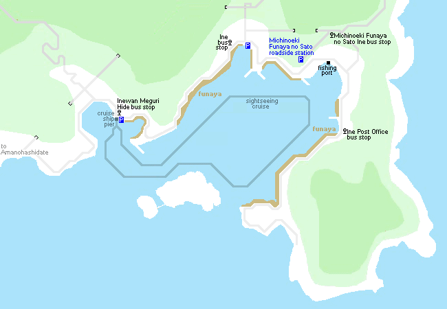 In Ine, all buses first make a stop at the cruise ship pier (ˆÉª˜p‚ß‚®‚èE“úo, Inewan Meguri Hide) before serving the Ine bus stop (ˆÉª) in the town center and the Michinoeki Funaya no Sato Ine (“¹‚̉wM‰®‚Ì—¢ˆÉª) roadside station. Afterwards, some buses continue further up the Tango Peninsula, while the rest terminate at the Ine Post Office (ˆÉª—X•Ö‹Ç‘O, Ine Yūbinkyoku-mae).